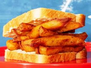 Originaire du Nord de l’Angleterre, ce sandwich est constitué de deux épaisses tranches de pain de mie, beurrées et garnies de frites. Simple et efficace, c’est un classique de l’alimentation anglaise présent dans tous les fish and chips, que Burger King a même tenté de copier… !