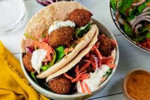 Pour les falafels : pois chiche secs, oignon coupé en brunoise, gousses d’ail écrasées, persil haché, coriandre fraîche ciselée, cumin moulu, levure (poudre à pâte), farine, eau, sel, huile végétale, pour la friture…