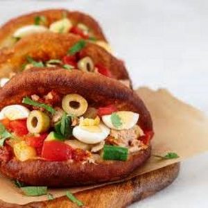 Le Pan bagnat originaire de Nice. Délice du Sud, ce sandwich et ses ingrédients frais (anchois, tomates, poivrons, olives, etc.) feront office de compagnon parfait pour un en-cas estival.