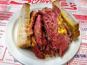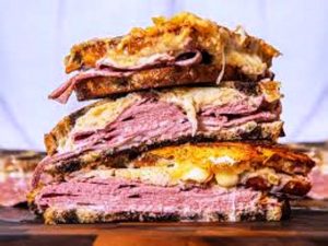 Pour le sandwich : tranches de pain de seigle (rye bread), boeuf salé (corned beef), choucroute (sauerkraut), tranches d’emmental, beurre…