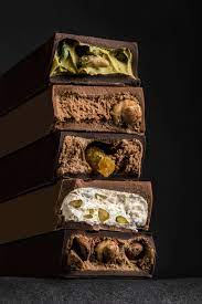 Mais aussi des crocos racés, des rochers pailletés de blé malté, et des pâtes à tartiner difficiles à étaler mais délicieuses à boulotter, dont un canon combo pistaches, éclats de macaron et fleur de sel également décliné en dés.