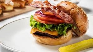 Un petit luxe aussi élégant que gourmand : tomates anciennes, salade craquante, pickles, oignons, bacon croustillant et cheddar fondant et bœuf provenant du ranch de Ralph dans le colorado…