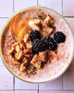 Pour le topping : banane coupée en morceaux, mûres, tranches de fruits frais, cerneaux de noix, graines de sésame, cannelle en poudre…