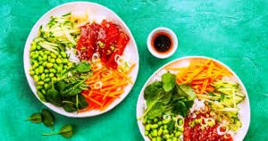 Les ingrédients utilisés pour réaliser cette recette sont : lentilles vertes, carottes, avocats, grosse betterave cuite, concombre, germes de soja, thon cru, graines de sésame, gingembre frais…