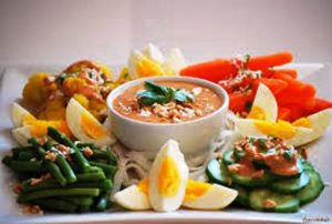 Les ingrédients utilisés pour réaliser cette recette sont : nouilles de riz plates, carottes, haricots verts ou pois mangetout, oeufs durs, germes de soja, concombre anglais, chou-fleur, pommes de terre, curcuma, cacahuètes rôties, coriandre fraîche hachée, sauce aux arachides, bouillon de poulet, beurre d’arachide, sauce Hoisin ou de sauce soya, miel, jus de citron vert, sambal oelek ou tabasco, sel, poivre…
