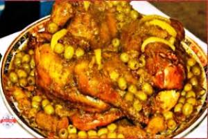 Le poulet Mhamer ou poulet aux olives et citrons confits à la marocaine est accompagné de purée de pommes de terre, frites, légumes telles que les carottes sautées etc…