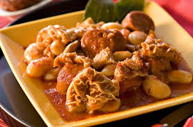 Pour la sauce : jambon de pays, chorizo fort, tomates bien mûres, carottes, oignon, gousses d’ail, petit poivron vert, piment de Cayenne en poudre, paprika en poudre, vin blanc sec, huile d’olive…