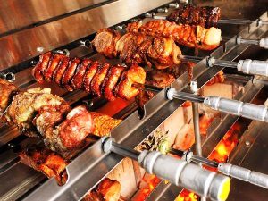 Au restaurant, dans les Churrascarias, les serveurs font le tour des tables avec de longues brochettes pour remplir les assiettes des convives de lamelles de viande à volonté.