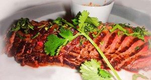 C’est un faux-filet de bœuf mariné et grillé, servi avec du riz et une sauce pimentée, parfumée de coriandre fraîche.