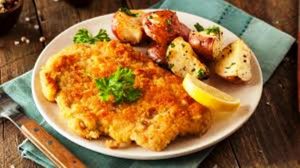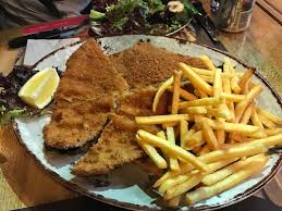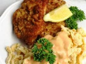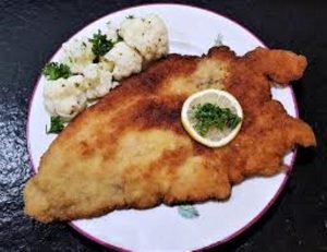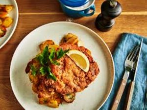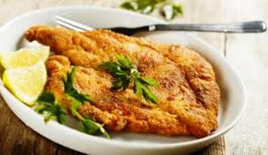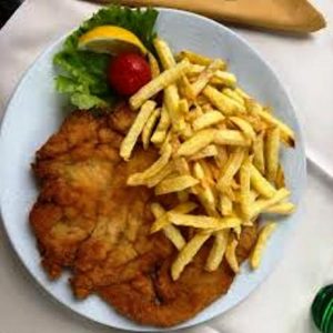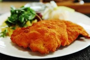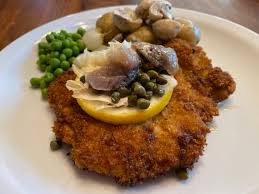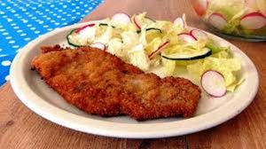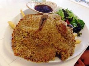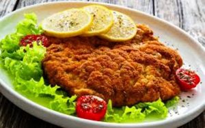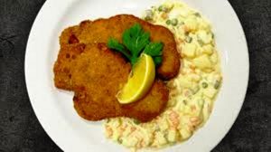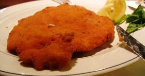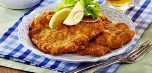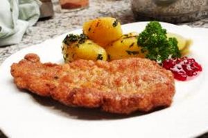 La Wiener Schnitzel d’Autriche est une tranche de veau, souvent servie avec une tranche de citron, de la confiture d’airelle et soit de la salade de pommes de terre soit des pommes de terre avec du persil et du beurre.