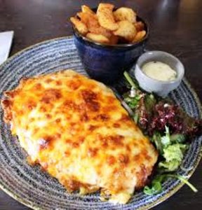 Le parmo, ou Teesside Parmesan, est une escalope populaire à Middlesbrough, Teesside, et un plat à emporter très apprécié dans le nord-est de l’Angleterre. Il se compose d’une escalope de poulet ou de porc panée garnie d’une sauce béchamel blanche et de fromage, généralement du cheddar.