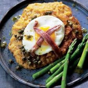 Holsteininleike (« côtelette Holstein ») servie avec œuf, anchois et câpres