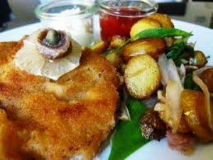 Wieninleike (« côtelette viennoise ») servie généralement avec une tranche de citron, des anchois et des câpres