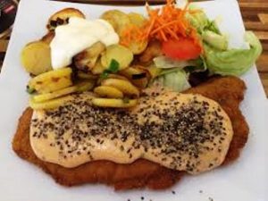 Le Zigeunerschnitzel (« escalope gitane ») est une escalope avec une sauce zigeuner contenant des tranches de tomates, de poivrons et d’oignons.