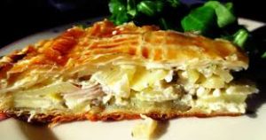 Les ingrédients utilisés pour réaliser cette recette sont : pâtes feuilletées, pommes de terre à chair ferme (Charlotte, Roseval), gousses d’ail, oignon, échalotes, persil plat frais, ciboulette ciselée, Fourme ou de Bleu d’Auvergne, jaune d’œuf, crème fraîche épaisse, noix de muscade râpé, sel, poivre…