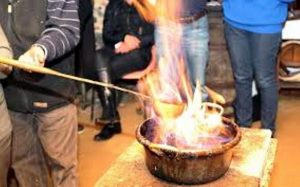 La distillation va alors se faire en deux chauffes et cela est fait en 24 heures ! D’abord, on porte à ébullition le vin et les vapeurs vont passer à travers le col de cygne jusqu’au serpentin de l’alambic. Le serpentin est entouré d’un bassin réfrigérant appelé « pipe », ce qui permet aux vapeurs d’alcool de se condenser. On obtient alors un liquide appelé « brouillis ».