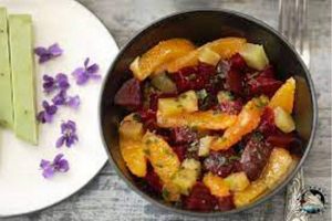 Les ingrédients de la recette sont : betterave cuite coupée en dés, oranges coupées en quartiers,  nopal cuit en dés (ou figues de Barbarie), jus de citron, huile de tournesol, sel, poivre, ciboulette fraîche ciselée…