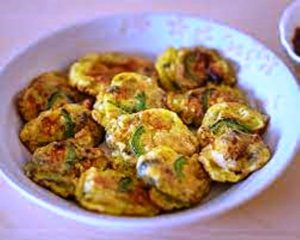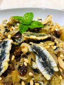Les ingrédients de cette recette sont : petites sardines fraîches, farine, huile d’olive, oignons, raisins secs réhydratés, pignons de pin, vinaigre rouge, sel…