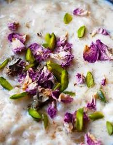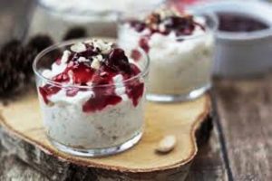 Ingrédients: riz rond de Camargue, lait, miel de tilleul, crème fraîche, fruits secs pour servir, cannelle en poudre…