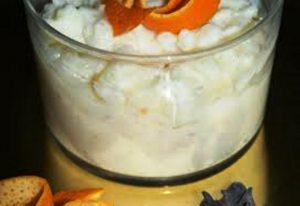 Ingrédients: lait entier, sucre en poudre, riz rond, gousse de vanille, quartiers de zestes d’oranges confits…
