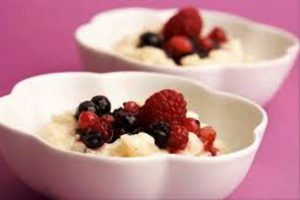 Ingrédients: riz rond, lait de coco, lait entier, eau de fleur d’oranger, sucre en poudre, fruits rouges, copeaux de noix de coco…