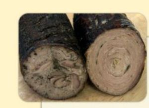 Le produit fini se présente sous une forme cylindrique irrégulière d’une longueur de 25 à 30 cm et d’un diamètre de 4 à 6 cm dont la couleur définitive résulte de l’oxydation avec l’air. La teinte noire, naturelle, dérive du fumage.