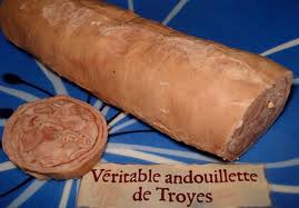 L’andouillette de Troyes est généreuse, sa recette est tenue secrète ( porc  ? ), les chaudins sont coupés dans le sens de la longueur, c’est manuellement que ces éléments sont incorporés dans un boyau naturel.