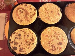 Ce sont de petites crêpes formées avec une purée de pommes de terre détendue avec du lait jusqu’à en faire une pâte liquide, et cuites à la poêle à déguster avec du poulet.