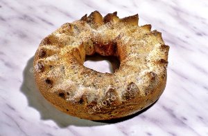 Une fois mélangés et pétris, farine de blé, levure, sel, eau, œufs, beurre, graines d’anis entières, zeste de citron, dont les proportions varient d’un artisan à l’autre, seront mis au repos plusieurs heures. La pâte sera ensuite façonnée en couronnes (lesquelles pourront être entaillées légèrement sur le dessus pour donner de courtes cornes), cuites à four bien chaud.