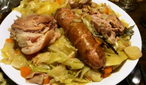 Ensuite, on fait cuire ensemble lard, oignons et bouquet garni (thym, laurier, céleri branche) auquel on ajoute après un temps, carottes, navets, poireaux, palette et chou, puis après un autre temps, un Petit Saint Antoine saucisson, une palette de porc, de la poitrine fumée, de la saucisse de campagne, des échalotes, des gousses d’ail .