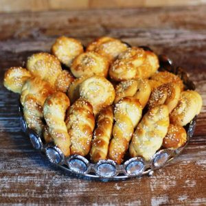 Les Koulourakia sont bien connus pour leur saupoudrage de graines de sésame et leur forme d’anneau distinctive. En fait, le mot est le diminutif d’un pain en forme d’anneau ou d’une bouée de sauvetage.