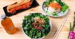Assiettes véganes d’inspiration africaine, bowls, burgers et cocktails caribéens proposés dans un restaurant animé.