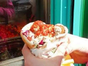 Pour ceux qui ne connaitraient pas sandwich fallafel, il s’agit d’un pain pitta chauffé et fourré de tomate, de salade, de choux, de beignets de purée de pois de chiche avec des sauces épicées.