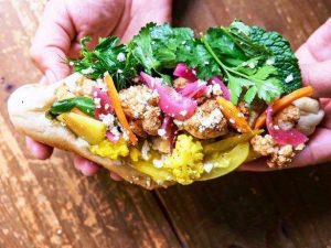 Sandwich Chicken Kefta: boulettes de poulet au ras el-hanout, sucrine, pickles, mayonnaise à l’ail confit, blette, piment doux, menthe et coriandre.