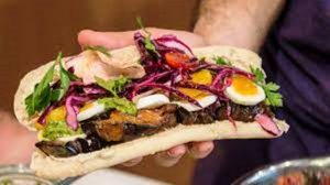 Sabich : sandwich national israélien à base d’aubergines frites, œuf dur, chou rouge, houmous, sauce amba (mangue, vinaigre, sel, moutarde, curcuma, piment) et tahini (purée de sésame).