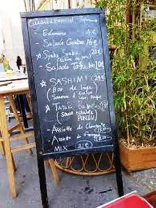 Le menu de la semaine est clairement indiqué sur la devanture mais aussi sur les cartes de visite. Ici on sert le Thieboudienne, LA spécialité du Sénégal : un plat mijoté à base de riz, légumes et poisson, le thieboudienne rouge indique qu’on a mis de la sauce tomate dans le riz.