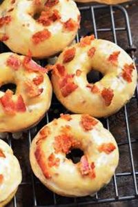 Aux États-Unis, la folie du bacon ne s’arrête plus, bien que repoussante au premier regard, ce dessert est devenu au fil des années très populaire..Les ingrédients utilisés pour réaliser les beignets au bacon sont : beignets style donut ou autre, sucre à glacer, sirop d’érable, lait, vanille, sel, bacon caramélisé, cassonade, cannelle, muscade…