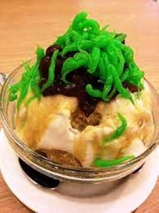 Fait à base de nouilles de riz au pandan gélatinées et sucrées, il s’accompagne d’un bouillon de lait de coco et d’haricots en chocolat., sirop de palme, glace pilée…