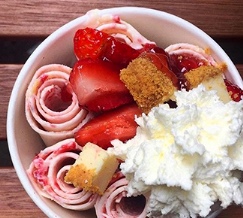 Très populaire sur les plages de Koh Phi-Phi de Thaïlande, l’ice cream rolls est une technique de fabrication de crème glacée très originale et délicieuse : sur une plaque très froide, on verse la crème liquide puis les fruits et épices (vanille, cannelle, chocolat, …) on mélange à la spatule en étalant finement sur la plaque qui congèle immédiatement l’ensemble, il faut ensuite créer de fins rouleaux de glace, servis dans un pot avec des fruits, coulis et bonbons en toping.