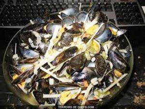 Liste des ingrédients utilisés dans cette recette sont : moules, échalotes, botte de persil, gousses d’ail, beurre, vin blanc sec, sel, poivre…