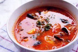 Liste des ingrédients utilisés dans cette recette sont : moules, crevettes crues, cabillaud, anneaux de calamar, fumet de poisson, oignon, gousses d’ail, boîte tomates concassées, concentré de tomates, Pastis, vin blanc, safran, piment, amandes en poudre, huile…