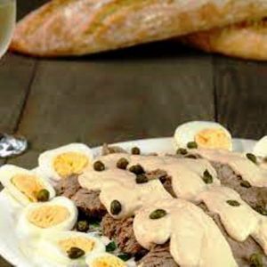 Pour la sauce : oeufs durs, huile d’olive, boîte d’anchois, boîte de thon, jus d’un citron, mayonnaise, moutarde, câpres, sel, poivre…