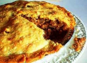 La tourtière de Québec, caractérisée par du porc haché, de l’oignon et du céleri haché. Elle est assaisonnée de laurier, de poivre noir, de sarriette, de romarin, de muscade et de cannelle, flocons d’avoine, oignons verts…