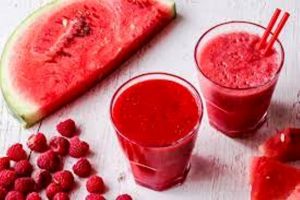 Les ingrédients utilisés pour réaliser la recette sont : moitié d’une grosse pastèque, framboises, sucre en poudre, jus de citrons, feuilles de menthe…