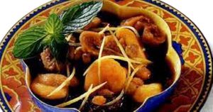 Les ingrédients utilisés pour réaliser la recette sont : abricots secs, pruneaux, figues sèches, raisins blonds, thé de Chine fumé, gousse de vanille, sucre brun, rhum ambré, zeste de citron, menthe…