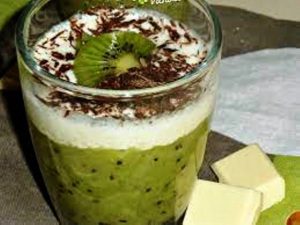 Les ingrédients utilisés pour réaliser la recette sont : kiwis bien mûrs, jus d’orange, sachet de sucre vanillé, lait de coco…