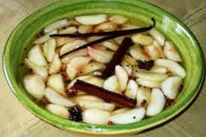 Les ingrédients utilisés pour réaliser la recette sont : pêches, vin blanc liquoreux, sucre, clou de girofle en poudre, cannelle en poudre, gingembre en poudre, poivre moulu, feuilles de menthe fraîche…