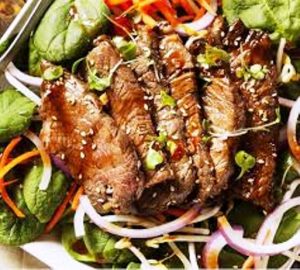 Les divers ingrédients utilisés pour réussir la recette sont : bœuf à griller de votre choix, sauce d’huître, sauce de soja, gousse d’ail…