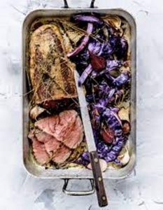 Les divers ingrédients utilisés pour réussir la recette sont : rôti de bœuf, chou rouge, gousses d’ail, beurre, petit bouquet de thym, bouillon de bœuf, botte de mini-betteraves, huile d’olive, poivre…