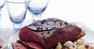 Les divers ingrédients utilisés pour réussir la recette sont : rôti de boeuf (noix de ronde), bardé, gousses d’ail, mélange multicolore de grains de poivre concassés, moutarde de Dijon, vin rouge…